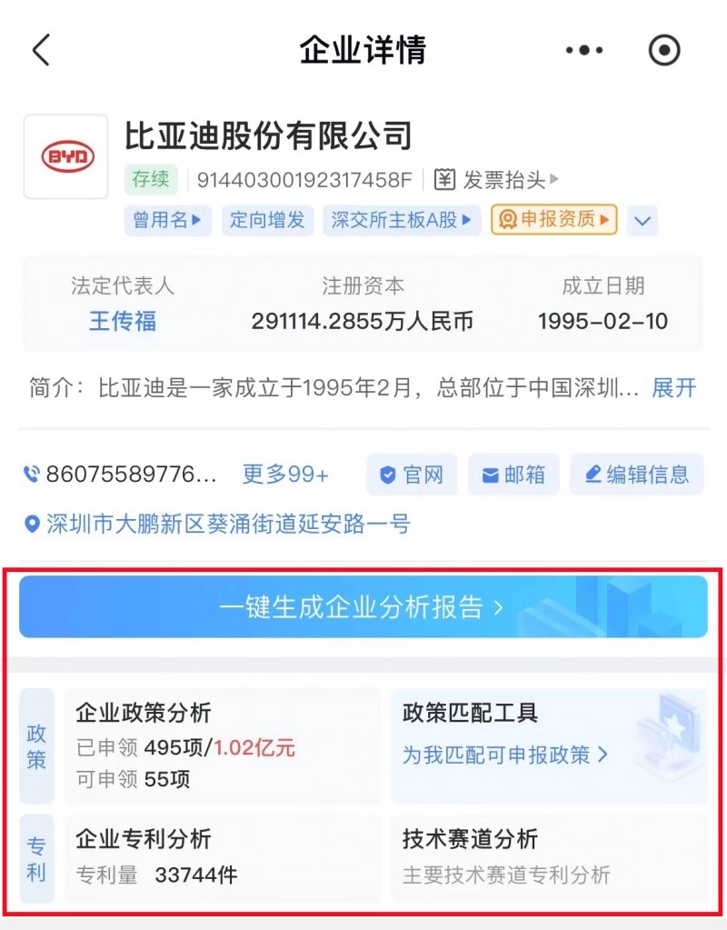 只需输入企业名称,除了基本的工商、股权结构、企业关系图谱这些其他平台的收费信息,企业主营产品、专利、商标、政策等维度的数据信息都能一次性查到。