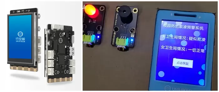 3.无线传输报警:当预警系统中语音识别模块,识别到关键词时,发送端通过行空板内置物联网模块,向位于同一网络下的接收端发送求救信息,教师接收信息后及时赶往事发地;