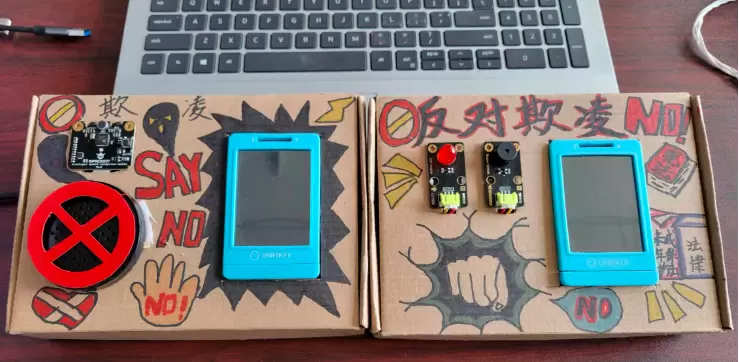 6.利用易得的快递纸盒,一个放置发射端的行空板、语音识别模块和喇叭,另一个放置接收端的行空板、红色LED灯和蜂鸣器,两个纸盒再配置锂电池充电宝提供电源。