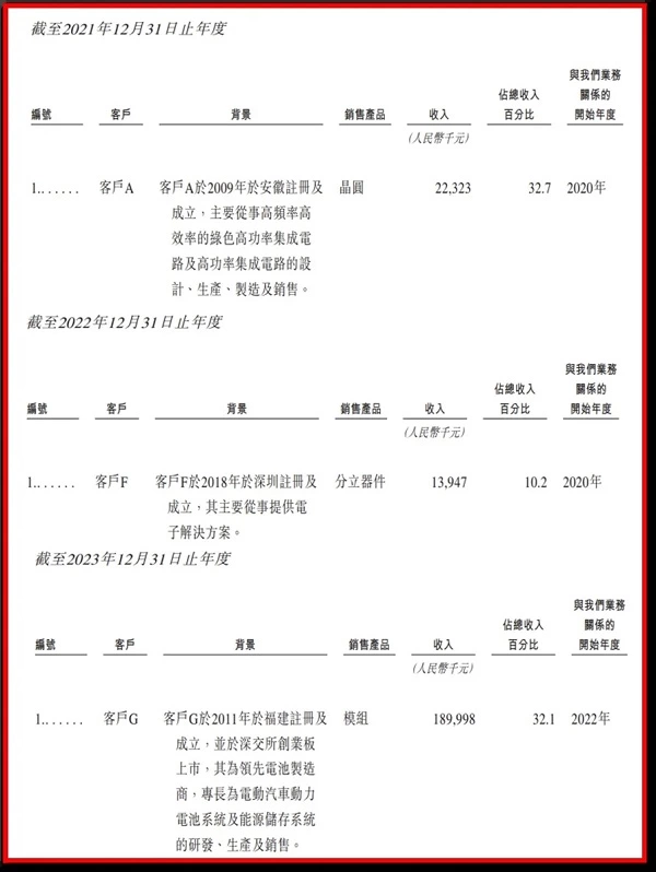 值得注意的是,2021年及2022年,来自最大客户A、F的产品订单类型分别为晶圆和分立器件,但在2023年,最大客户G的订单类型则为模组产品。