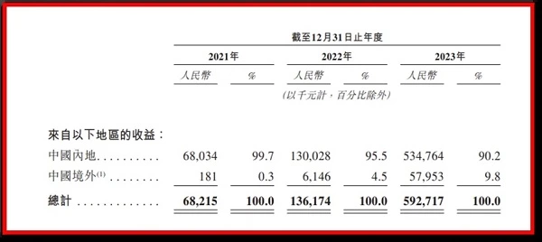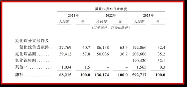 文件进一步透露,2021年至2023年,中国市场始终是英诺赛科的业务重心,其收入分别为0.68亿、1点3亿及5点35亿,占同年总收益的99.7%、95.5%及90.2%。