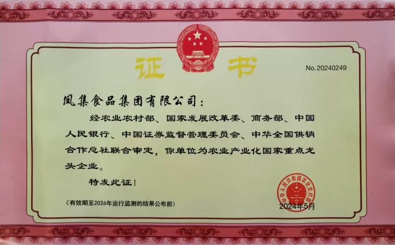近日,农业农村部公布了第八批农业产业化国家重点龙头企业认定名单,凤集食品集团有限公司成功进入该名单。