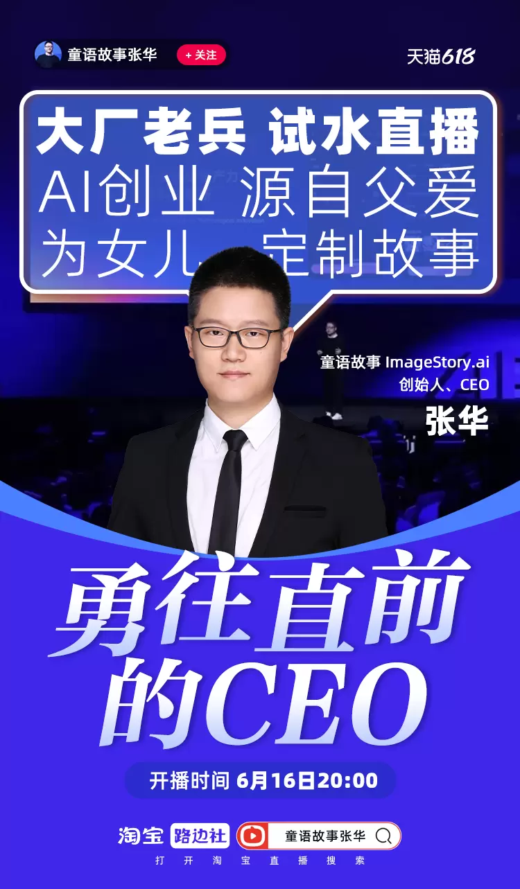 自淘宝推出“勇往直前的CEO”计划以来,一大拨企业家正涌向淘宝直播间。6月16日,AI绘本“童语故事ImageStory”的创始人张华,也将开启入淘首秀。