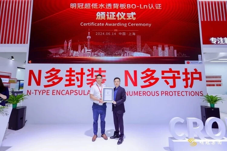 在此次展会上,明冠的CPC背板荣获国际独立的第三方检测、检验和认证机构德国TÜV莱茵颁发的最新光伏组件用背板国际标准IEC 62788-2-1:2023认证证书,标志着明冠背板技术达到了最新的国际标准要求,是对公司自主研发能力和技术实力的充分肯定。