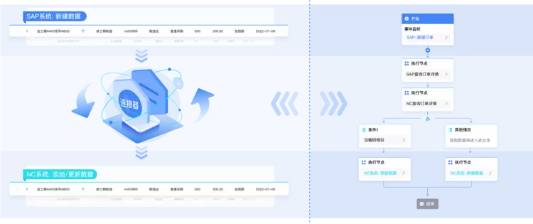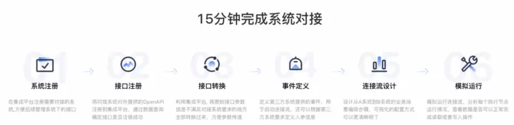 1、可视化编排:拖拉拽方式实现系统集成更简单;从系统注册、接口注册、接口转换到事件定义、连接流设计、模拟运行,15分钟实现完成系统对接。