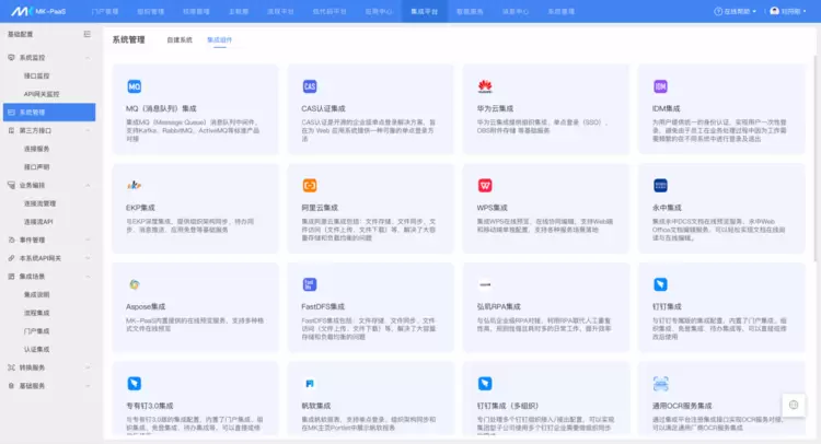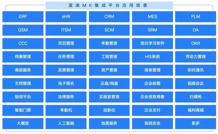 蓝凌MK集成平台支持50+类、1000+软件、企业服务、智能硬件等集成,不仅让业务与管理更高效,也助力企业IT运维降本增效,创造更多价值。