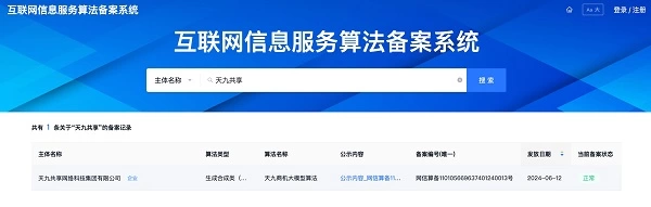 6月12日,国家互联网信息办公室发布了《国家互联网信息办公室关于发布第六批深度合成服务算法备案信息的公告》。其中,天九共享集团旗下天九共享网络科技集团(以下简称“天九网科”)研发推出的“天九商机大模型算法”顺利通过备案。