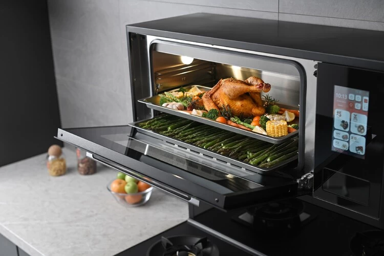 烧菜太累,不想动手怎么办?是时候让蒸烤箱来大展身手了。50L大容量内胆,四层搁架设计,最多可同时放置四层蒸盘,可以同时蒸制2条大鱼、30个生蚝、40个包子,一次性烹饪多道美食,满足全家人饮食需求!