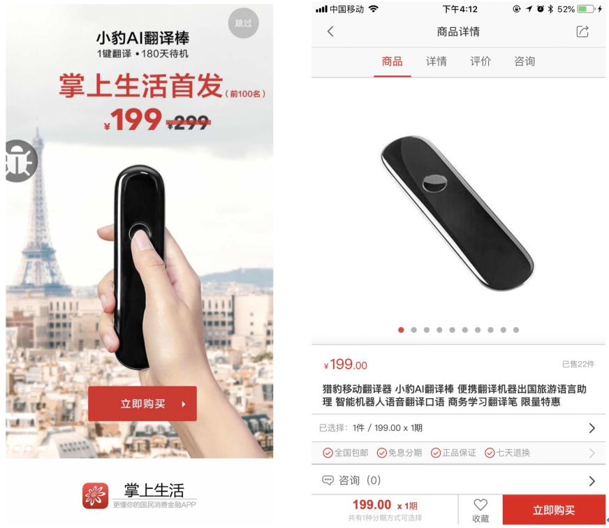 AllinAI的猎豹移动继联合芝麻信用、机蜜推出“小豹AI音箱1元试用30天”活动后,再次开拓市场新渠道,联合招行信用卡掌上生活App掀起小豹AI翻译棒抢购风潮。8月20日通过招行信用卡掌上生活App购买小豹AI翻译棒,前100名即可享受直降100元,到手价199元的限时优惠购买福利;正价299元购买的用户,可享全国包邮、七天退换、三期免息分期(99.67元x3期)的便利政策。