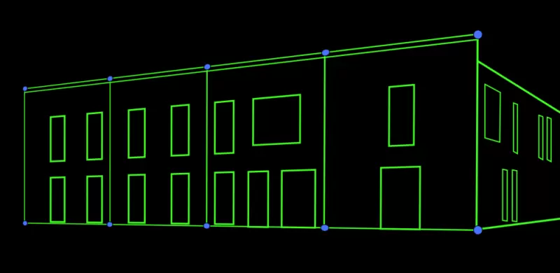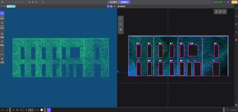 为了进一步优化3D点云技术在建筑绘图场景的应用,标贝科技在自研的3D点云标注平台新增3D点云建筑制图能力。基于先进的算法对点云数据进行处理和分析,不仅可以通过点选立面范围图框精确定位到指定建筑立面,还支持批量标注边长、立面图要素分类汇总。这样既可节省显示数据,又不失模型的显示细节,为用户提供了更加便捷的点云立面绘图方式。