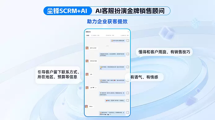 在本次研讨会上,尘锋产品总监亢超详细分享了尘锋SCRM+AI的应用实践。据了解,获客难问题一直困扰着企业,为了降低获客线索成本,提高获客效率,越来越多的企业选择通过新媒体获客,如CEO直播、企业全员营销等模式,已经成为企业当前营销获客趋势。亢超分享到,为了帮助企业提高新媒体获客效率,尘锋通过结合AI大模型技术,于2024年初上线了「AI套电机器人」功能,可以帮助企业模拟金牌销售引导客户留资获客,该功能现已帮助家装家居、汽车销售、教育等行业实现获客提效。