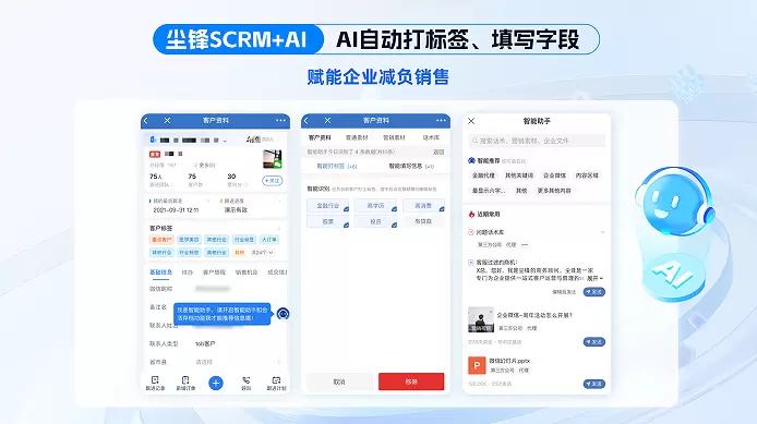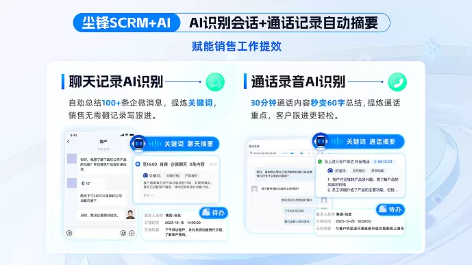 此外,尘锋SCRM一直关注AI大模型技术的发展,基于企业真实业务痛点调研,结合AI大模型能力,尘锋SCRM已正式上线了可以自动阅读客户沟通记录、通话信息的「AI自动摘要」能力,帮助企业减负销售,让销售专注在销售动作上,提高企业转化效率;同时为了满足企业精细化私域运营需要,尘锋也已推出「AI自动打标」能力,可以帮助企业规范化完成人群标签收集与匹配,减少人工操作,提高标签精准度与更新效率,帮助企业实现更高效精准的客户信息管理,助力企业提效私域运营。