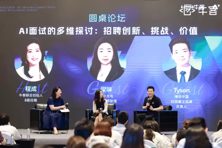活动最后,牛客联合创始人&副总裁程成作为主持人邀请友达光电人力资源副理梁咪、博世中国校园雇主品牌负责人Tyson共话AI面试的挑战与价值。
