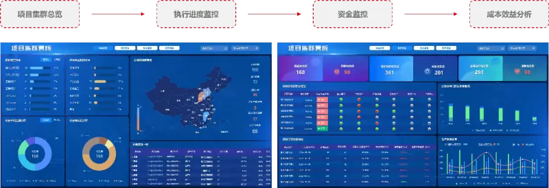 此外,集成用友数据服务,可呈现项目集群看板,实现项目全览和各类关键数据的智能化分析,包括进度、资金使用和成本核算等维度的数据。