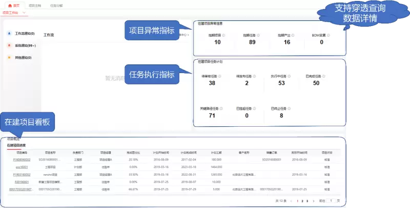 项目工作台指标包括项目异常指标、任务执行指标和在建项目指标,可以按日或按周等不同的时间颗粒度来查看项目各项指标情况,指标支持穿透查询到项目的明细信息。