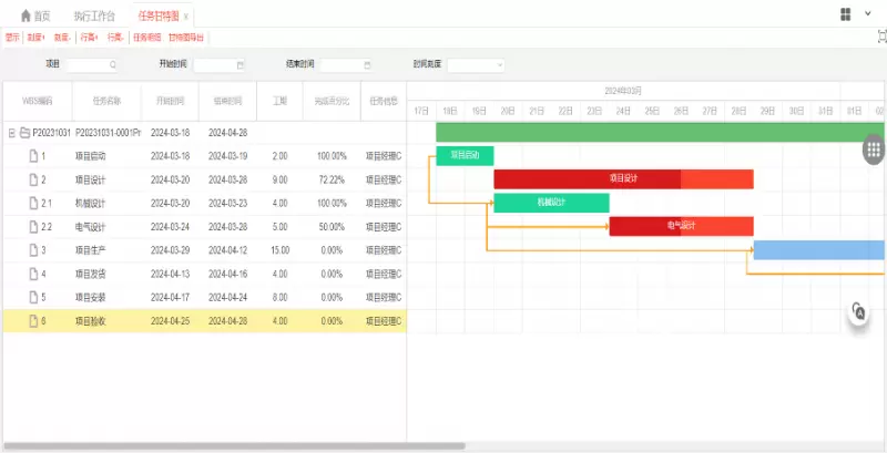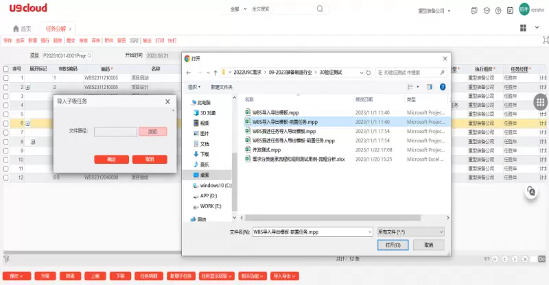 WBS任务分解,全面支持Office Project格式文件的导入导出。支持导入同级任务与下级任务两种方式,导出标准导入模板,目前不支持自定义导入模板。