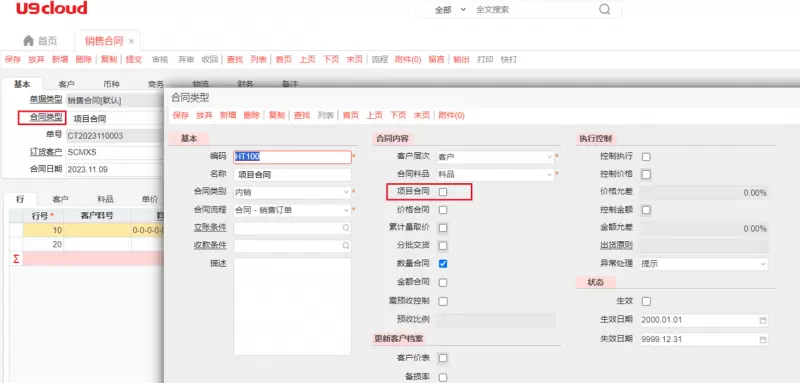 销售合同承载项目合同,对项目投标后的合同金额等进行管理。后续立项、出货、项目执行过程、项目收入成本都与项目合同关联。