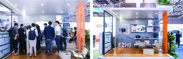 本届展会,昱能科技展台设计“橙”意满满,焕新升级,整体采用简约橙色系,融入绿色、开放的发展理念,取现代之美学,集科技之灵动,将品牌文化融入每一个细节,给人以舒适体验;同时以超大展台空间,打造DIY阳台、户用、工商业光储充应用场景,展现光伏智造引领未来的美好图景,不断掀起人潮涌动,成为众多观众打卡地点。