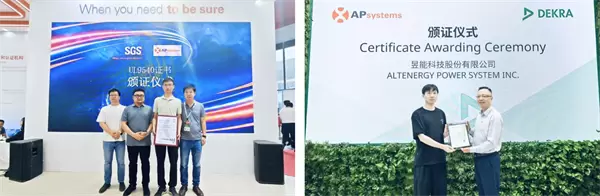 展会同期,在客户伙伴、行业专家、专业媒体等众多嘉宾及观众的见证下,国际公认的测试、检验和认证机构SGS,为昱能科技储能系统产品颁发北美UL9540认证证书。同时,全球著名认证机构DEKRA德凯,为昱能科技ELT系列储能逆变器颁发VDE4105标准德国并网COC认证证书,这充分表明昱能科技储能逆变器在安全和可靠性等方面均已达到国际标准认可的先进水平,体现了公司优异的研发创新能力,同时也为该系列产品进一步扩大全球市场规模奠定了良好基础。