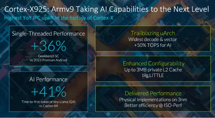 AI 性能方面,Cortex-X925 取得了41%的性能提升,可显著提高大语言模型 (LLM) 等设备端生成式 AI 的响应能力。这主要得益于 Cortex-X925 的微架构演进,包括迄今为止最宽的解码器和矢量处理单元,使得 TOPS性能提升了 50%。
