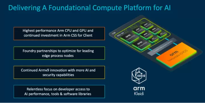 面向全新计算需求,Arm日前推出了终端计算子系统 (CSS),为旗舰系统级芯片(SoC) 提供基础计算要素,包括最新的 Armv9.2CPU、Arm Immortalis GPU、基于3nm工艺生产就绪的 CPU和GPU 物理实现,以及最新的 CoreLink系统互连和系统内存管理单元 (SMMU)。此外,还有同步推出的 Arm Kleidi软件库,有助于软件开发者无缝获得Arm CPU的最佳性能,包括面向AI工作负载的KleidiAI 和面向计算机视觉应用的 KleidiCV。