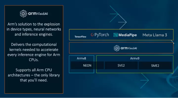 KleidiAI 是一套面向 AI 框架开发者的计算内核,使他们能够在各种设备上轻松获得 Arm CPU 上的最佳性能,并支持 Neon、SVE2 和 SME2 等关键 Arm 架构功能。KleidiAI 与 PyTorch、Tensorflow、MediaPipe 等热门 AI 框架集成,旨在加速 Meta Llama 3、Phi-3 等关键模型的性能,并且还可前后兼容,以确保 Arm 在引入更多技术时依然能适用未来市场的需求。