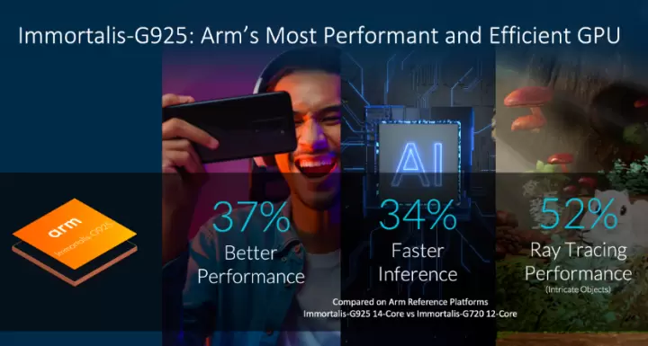 CSS平台中还包括最新的Immortalis-G925 GPU,这是 Arm 目前性能最强、效率最高的 GPU,在各款领先的手游应用中实现了 37% 的性能提升,并在多个 AI 和 ML 网络上提升了 34% 的性能。在应用方面,Immortalis-G925 面向旗舰智能手机市场,而包括 Arm Mali-G725 和 Mali-G625 GPU 在内的全新高可扩展性 GPU 系列,面向从高端手机到智能手表、XR 、可穿戴设备等广泛的消费电子设备市场。