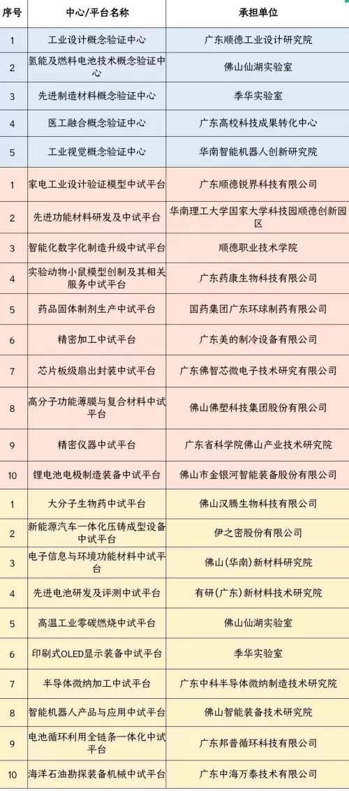 会上,季华实验室先进制造材料概念验证中心、仙湖实验室氢能及燃料电池技术概念验证中心、广东顺德工业设计研究院工业设计概念验证中心等5个概念验证中心,以及顺德职业技术学院的智能化数字化制造升级中试平台、广东美的制冷设备有限公司的精密加工中试平台、广东佛智芯微电子技术研究有限公司的芯片板级扇出封装中试平台等20个中试平台被授牌。
