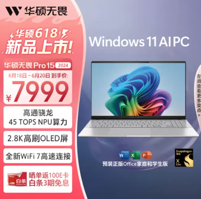 在当今这个快节奏的社会中,用户需要的不仅仅是一台电脑,更是一个能够帮助我们高效工作、娱乐生活的得力助手。目前,搭载骁龙X Elite处理器的华硕无畏Pro15 2024已正式上架开售,新机到手价7999,购机即可享晒单返E卡以及白条三期免息。