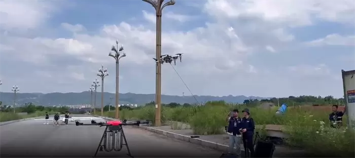 在演练的第四个科目中,卓翼智能展示了系留无人机的单兵携带与持久照明功能。该无人机设计轻便,便于单兵携带,且通过地面供电实现持久照明。