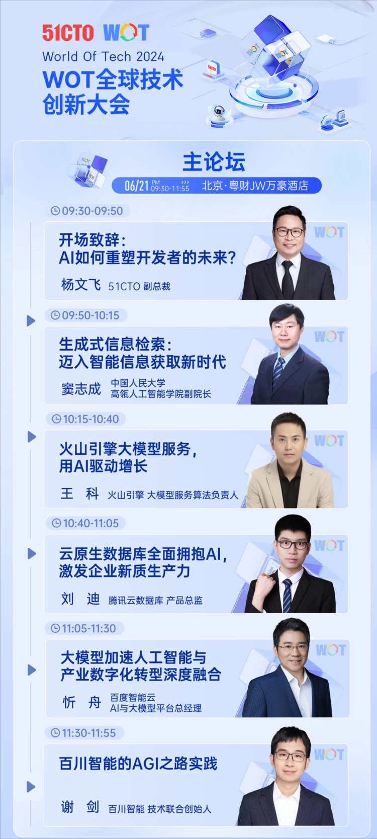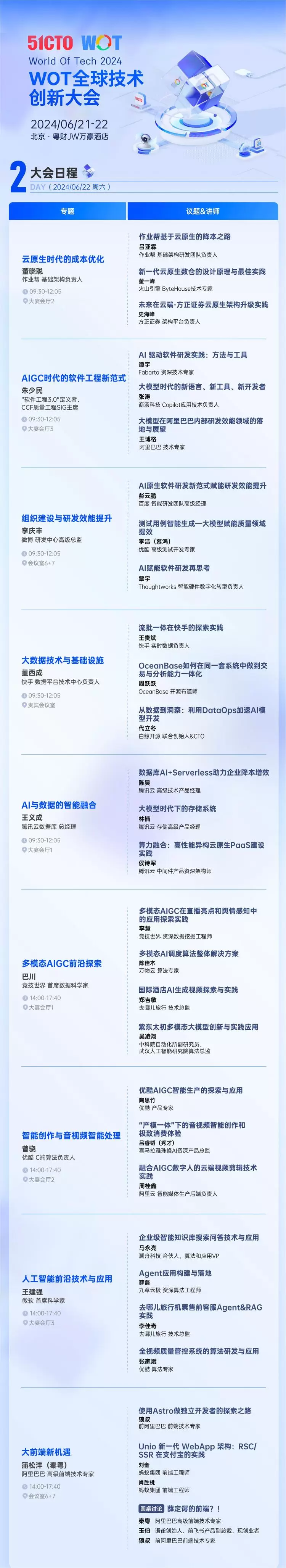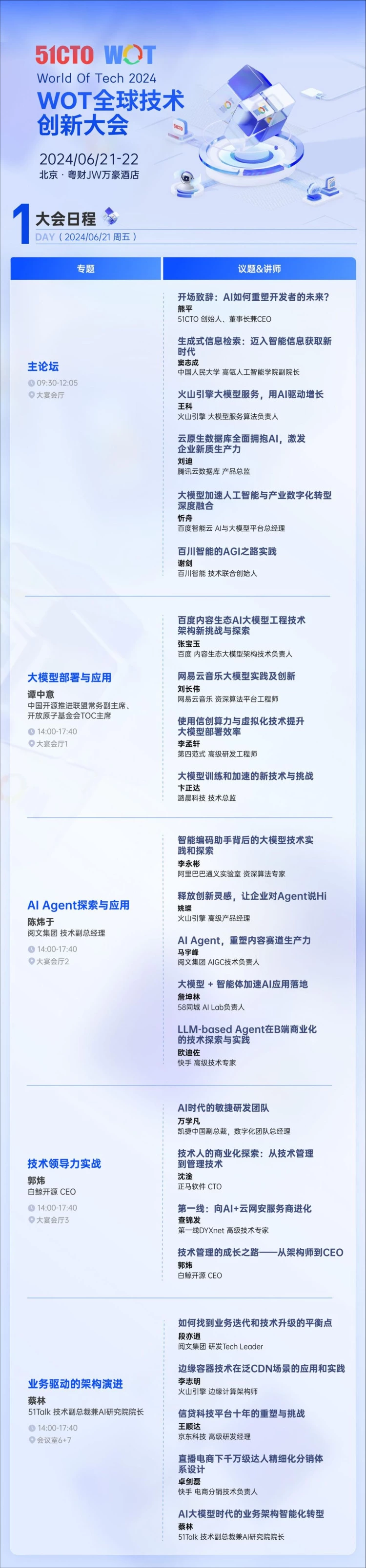 WOT全球技术创新大会将于本周五、周六,也就是6月21日-22日在北京召开,这也是上半年最该参加的一场综合技术大会。本届大会奉上AIGC时代的软件工程新范式、AI Agent探索与应用、多模态AIGC前沿探索等多个大模型、AIGC相关主题。此外,继续聚焦领导力、研发效能、架构演进、大数据等热门技术话题。所有讲师、议题均已就位,等你现场来聆听!