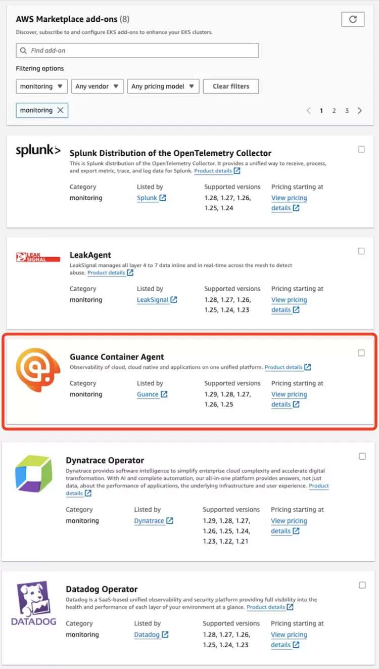 在 2022 年的 re:Invent 大会上,亚马逊云科技宣布了一项重大更新:亚马逊云科技 Marketplace 为 Amazon Elastic Kubernetes Service(Amazon EKS)提供了附加组件的支持。这一创新功能极大地丰富了 EKS 的生态系统,使用户能够利用亚马逊云科技 Marketplace 中的软件来增强其 EKS 集群的能力。