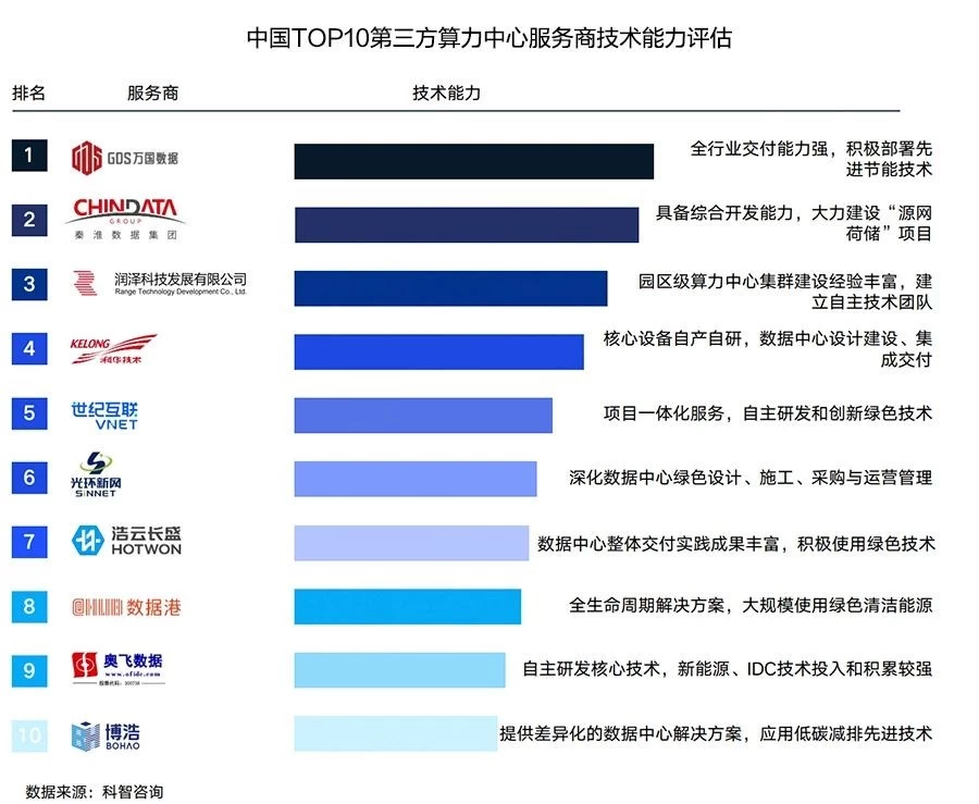 科华数据凭借多年行业深耕经验、规模体量、市场化运营能力、服务技术能力、销售能力、绿色化水平等多方面的领先优势,在“中国算力中心服务商综合发展指数TOP10”企业榜单中位列第8位,在“中国第三方算力中心服务商技术能力评估TOP10”中位列第4位,处于行业领先地位。