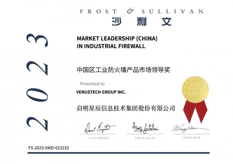 近日,弗若斯特沙利文(Frost & Sullivan,以下简称“沙利文”)正式发布2023年中国工业防火墙市场排名,启明星辰集团工业防火墙以36.7%的市场份额雄踞榜首,并再次荣获“2023年度中国区工业防火墙产品市场领导奖”。至此,启明星辰集团已连续六年领跑中国工业防火墙市场。