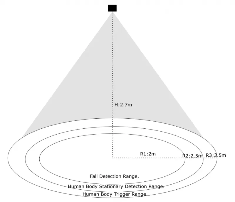 测试结果:传感器能正常检测到人员跌倒,检测到人员跌倒后板载跌倒状态指示灯亮起。测试人员起身后灯光熄灭。安装高度2.7m跌倒检测范围约为4m直径的圆形。