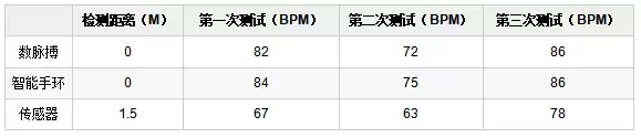 测试方式:将传感器调到睡眠检测模式,传感器放置与人体正前方1.5m处传感器正对检测人员胸部,通过同时运动手环检测、摸脉博和传感器检测数据三组数据对比验证传感器心率测试准确性