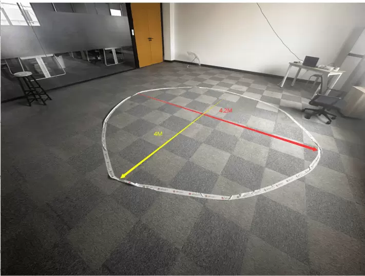 测试方式:将传感器调至跌倒检测模式顶装,安装高度设置为270cm,检测人员在检测范围迅速躺下测试传感器能否检测到人员跌倒。并用胶布贴出跌倒检测范围。