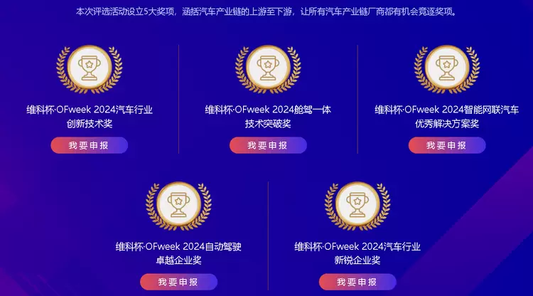 为进一步激发汽车行业创新活力,推动产业升级,维科杯·OFweek2024汽车行业年度评选隆重设立五项大奖,全面覆盖产业链上下游,旨在表彰在技术创新与突破、优秀方案应用、企业成长与表现等多个维度表现卓越的行业佼佼者,以“维科力量”共同见证并推动行业的蓬勃发展。具体奖项设置如下: