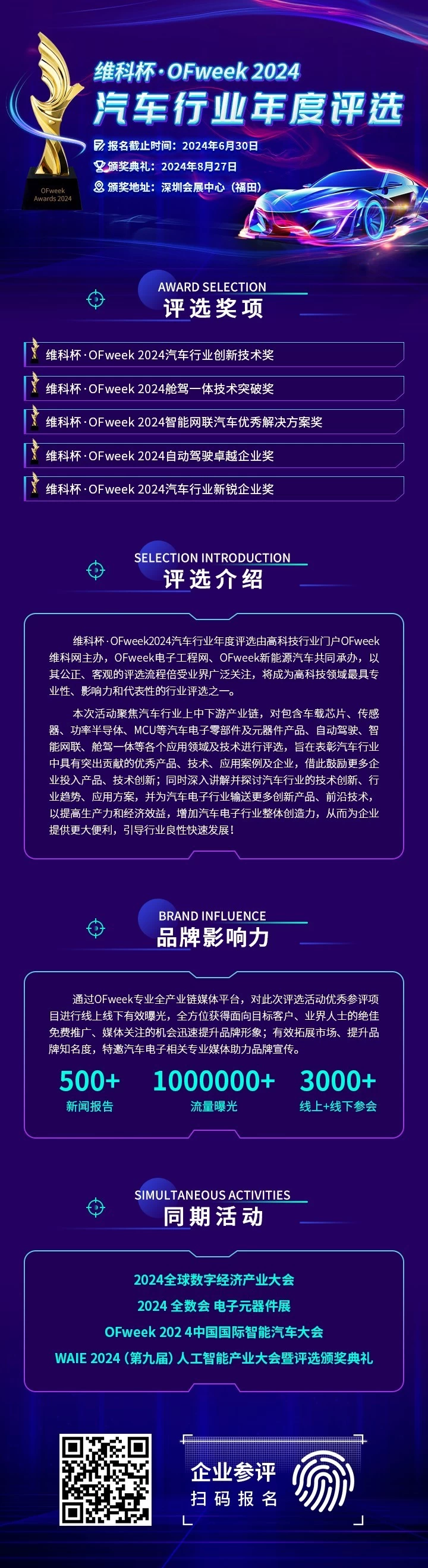 在创新与变革的浪潮中,汽车行业始终站在技术前沿,引领未来的出行方式。为了表彰相关行业优秀企业的卓越成就与杰出贡献,维科杯·OFweek 2024汽车行业年度评选报名正在火热进行中!
