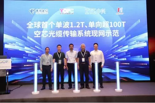 随后进入成果发布环节,中国电信研究院网络技术研究所副所长雷波介绍了中国电信“全球首个单波1.2T、单向超100T空芯光缆传输系统现网示范”成果,并邀请中国电信杭州分公司建设部副总经理李俊、长飞光纤高级副总裁闫长鹍、中兴通讯电信总监办副总监张云龙和华信设计院高级顾问沈梁上台参与成果发布仪式。