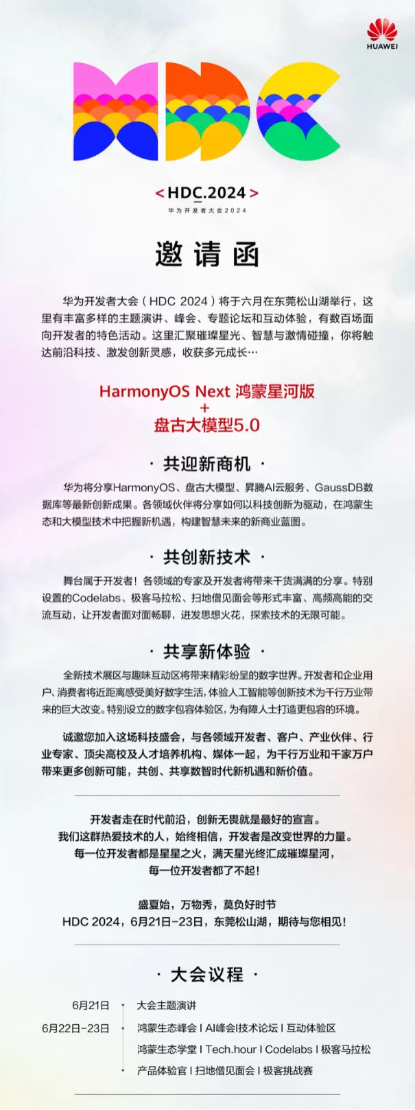 2024年6月21日,华为开发者大会2024(HDC 2024)于东莞松山湖盛大启幕。本届大会以“共创新技术、共享新体验、共建新蓝图”为核心主题,致力于搭建一个广大开发者跨界交流与合作的高端平台,促进全球科技生态系统内的知识共享与协同创新。
