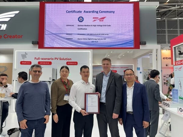 科华数能海外产品总监何宏伟说到:"此次证书的获得,充分证明了科华数能产品在电网适应性等方面的高标准和严要求。这不仅增强了科华数能产品的市场竞争力,也为公司赢得了更多客户的信任和认可。此次合作进一步加深了科华数能与TÜV南德之间的合作关系。作为全球知名的检测认证机构,TÜV南德的专业能力和丰富经验将为科华数能提供更多技术支持。双方未来的深化合作有望助力科华数能在产品研发、生产、质量等方面取得更大的突破,从而提升公司的整体实力和市场地位。"