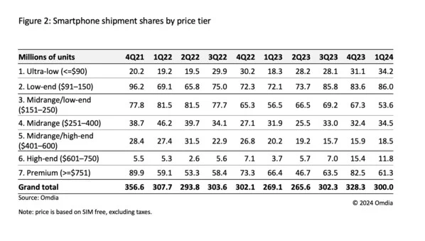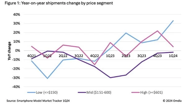 2023年初,售价在151美元到600美元之间的中端手机需求显著下降,至今尚未恢复。 在2024年第一季度,该类手机的出货量为1.07亿台,比2023年第一季度的1.09亿台减少了200万台。 如图1所示,这一长期趋势显示,近年来中端领域呈现同比负增长趋势,而低端领域自2023年第一季度以来呈现正增长的趋势,高端领域自2023年第三季度以来也有所增长。