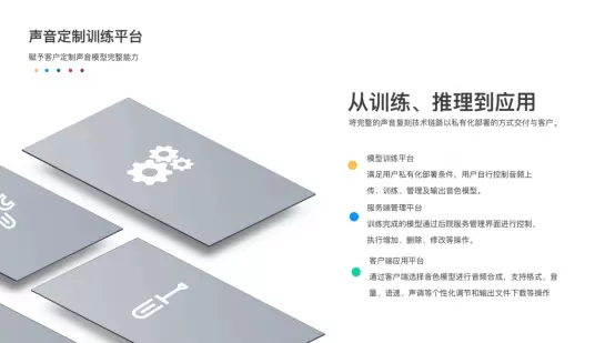 语音合成模块,标贝科技不仅支持方言和小语种标准音色定制,还可以基于声音定制训练平台。提供从训练、推理到应用全流程,包括录音棚、录音师、韵律标注任务、MOS 评测任务等服务。将完整的声音复刻技术链路以私有化部署的方式交付与客户,让客户具备自主推理训练音色能力,满足大型项目能力完全自主掌控的需求。