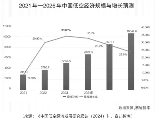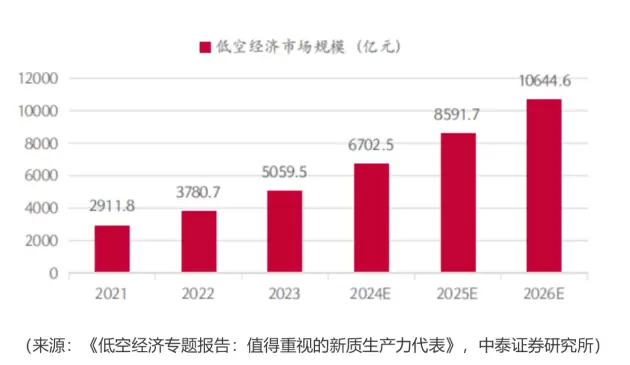 根据中泰证券《低空经济专题报告:值得重视的新质生产力代表——元年或至》:中国低空经济规模2023年超过5000亿,同比+33.8%,预估2026年有望突破万亿元,达到10644.6亿元。此外,IDEA研究院数据显示到2025年对国民经济的综合贡献值将达3-5万亿元人民币。
