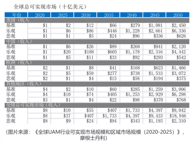根据摩根士丹利《全球UAM行业可实现市场规模和区域市场规模(2020-2025)》:2030年,技术发展最为乐观,监管政策也能够及时放开的情况下,中国eVTOL可实现市场收入达到1880亿美元;技术成熟程度和政策配套均为中等水平时,可实现市场收入为260亿美元;而最不乐观的情况,可实现市场收入也会达到110亿美元。