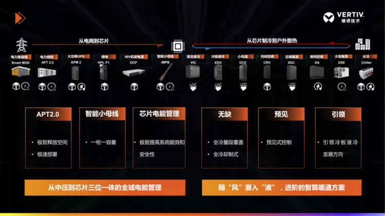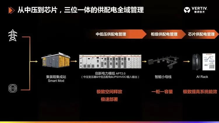 维谛技术的超融合智算解决方案,从中低压到柜级再到芯片,助力智算中心实现三位一体全域电能管理。