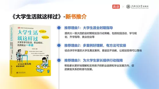 李润来表示,高途考研与上海交通大学出版社此次合作,标志着教育资源整合的进一步深化。此次合作推出的新书《大学生活就这样过》涵盖了大学四年各个阶段的学习建议和行动策略,帮助学生全面发展。