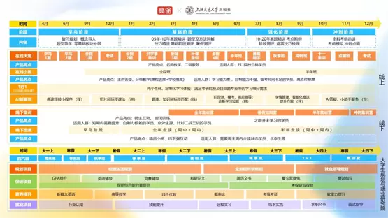 同时,李润来在发布会上详细介绍了高途大学生规划产品布局。其中,规划产品涵盖了校园生活规划、全流程升学规划、就业指导规划三个方面,帮助学生在大学四年中每个阶段都能有明确的发展方向和合理的时间管理策略。此外还有英语、高等数学,技能提升、就业指导等产品,让大学生们能够更好地提升学术背景和职业技能,为未来的升学和就业做好充分准备。