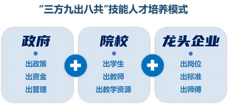 “产教评”技能生态链是由广东省人力资源和社会保障厅推出。由政府、龙头企业、院校三方联动,创新探索政府出政策、出资金、出管理;龙头企业出岗位、出标准、出师傅;院校出学生、出教师、出教学资源。企校“共同制定培养标准、共同制定评价标准、共同招生招工、共同开发课程、共同培训、共同评价、共同激励、共同管理”的“三方九出八共”技能人才培养模式。